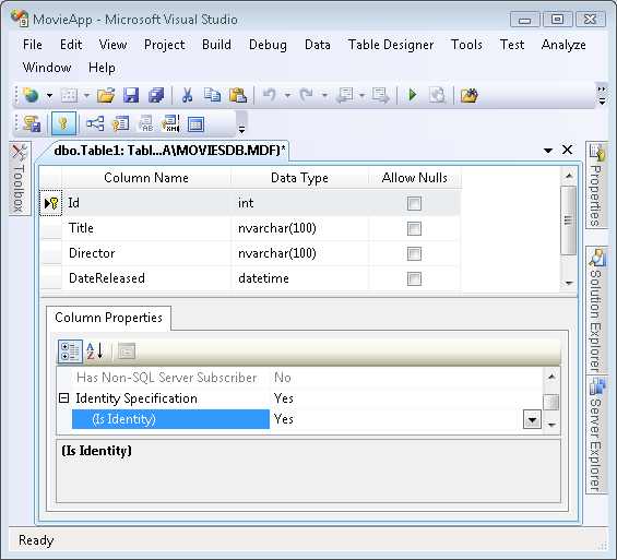 第一列 Id 列具有两个特殊属性。 首先,需要将 ID 列标记为主键列。 选择 ID 列后,单击“ 设置主键 ”按钮(它是看起来像键的图标)。 其次,需要将 ID 列标记为“标识”列。 在“列”属性窗口中,向下滚动到“标识规范”部分并展开它。 将 Is Identity 属性更改为“是”值。 完成后,表应类似于图 4。