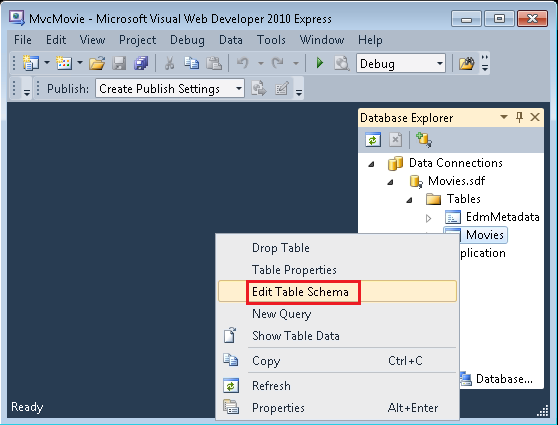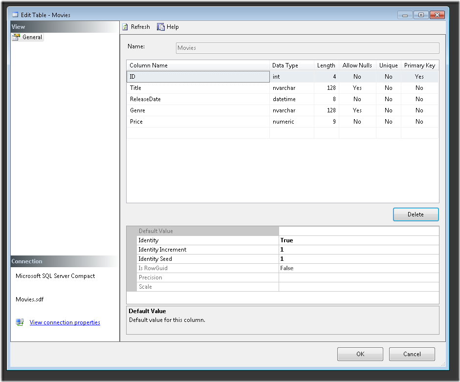 如果双击 Movies.sdf 时收到错误,请确保已安装 SQL Server Compact 4.0(运行时 + 工具支持)。 (有关软件的链接,请参阅本教程系列第 1 部分中的先决条件列表。如果立即安装版本,则必须关闭并重新打开 Visual Web 开发人员。