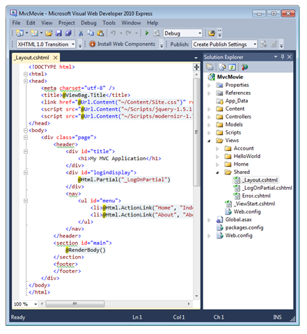 首先,想要更改页面顶部的“我的 MVC 应用程序”标题。 该文本对于每个页面都是常见的。 它实际上仅在项目中的一个位置实现,即使它出现在应用程序中的每一页上。 转到解决方案资源管理器中的 /Views/Shared 文件夹,打开 _Layout.cshtml 文件。 此文件称为 布局页 ,它是所有其他页面使用的共享“shell”。
