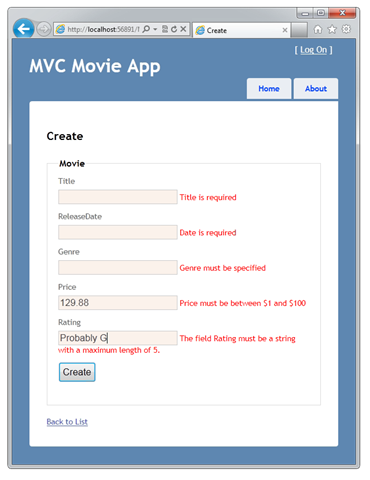 真正的好处是,无需更改类或 Create.cshtml 视图中的单个代码MoviesController行才能启用此验证 UI。 本教程前面创建的控制器和视图会自动选取使用模型类的属性 Movie 指定的验证规则。