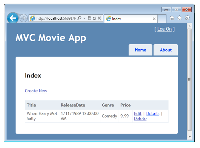 ASP.NET MVC 3 基架机制会自动为你创建 CRUD(创建、读取、更新和删除)操作方法和视图。 现在,你有了一个功能齐全的 Web 应用程序,可用于创建、列出、编辑和删除电影条目。
