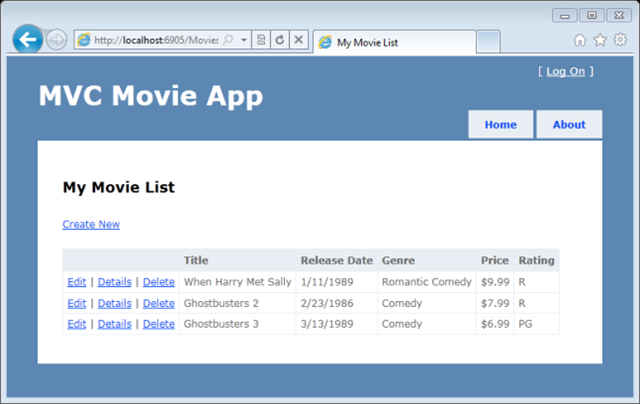 你将实现一个简单的电影列表应用程序,该应用程序支持从数据库创建、编辑和列出电影。 下面是要生成的应用程序的两个屏幕截图。 它包括显示数据库中电影列表的页面: