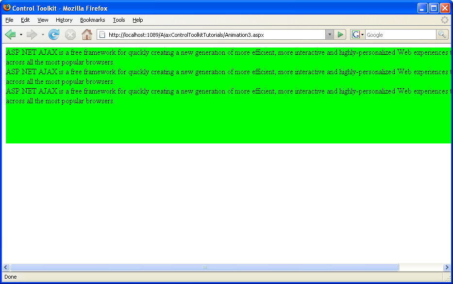 ASP.NET AJAX 控件工具包中的动画控件不仅是一个控件,而且是一个用于向控件添加动画的整个框架。 它允许一个接一个地运行多个动画。