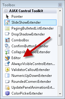 HTML 编辑器控件位于包含其余 AJAX 控件工具包控件的工具箱中。 它命名为编辑器控件, (请参阅图 3) 。