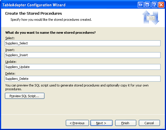输入主查询并单击“下一步”后,向导允许我们命名将生成的四个存储过程。 如图 4 所示,将这些存储过程Suppliers_Select命名Suppliers_Insert为Suppliers_Update