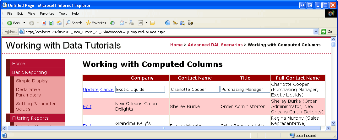 在本教程中,我们讨论了规避计算列带来的挑战的技术。 具体而言,我们在 TableAdapter 中使用存储过程来克服 TableAdapters 中使用即席 SQL 语句固有的脆弱性。 当 TableAdapter 向导创建新的存储过程时,请务必让主查询最初省略任何计算列,因为它们的存在会阻止生成数据修改存储过程。 最初配置 TableAdapter 后,可以重新准备其 SelectCommand 存储过程以包含任何计算列。