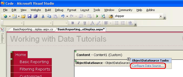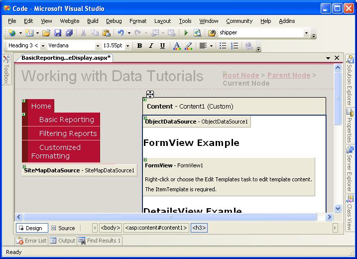 首先打开 SimpleDisplay.aspx 文件夹中的页面 BasicReporting ,切换到设计视图,然后将 ObjectDataSource 控件从工具箱拖动到页面的设计图面上。 ObjectDataSource 在设计图面上显示为灰色框,因为它不生成任何标记;它只需通过从指定对象调用方法来访问数据。 ObjectDataSource 返回的数据可由数据 Web 控件显示,例如 GridView、DetailsView、FormView 等。