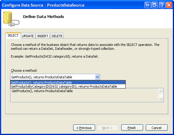 选择 ProductsCL后,单击“下一步”。 SELECT选项卡中的下拉列表有两个条目,GetProducts()和GetProductsByCategoryID(categoryID),而UPDATE选项卡只有UpdateProduct的重载。 在GetProducts()中从 SELECT 选项卡选择方法,在UpdateProducts中从 UPDATE 选项卡选择方法,然后单击“完成”。