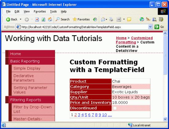 我们不想显示 CheckBoxField,而是显示指示产品是否停止使用的文本。 为此,我们可以从 DetailsView 中删除 CheckBoxField,然后添加一个属性 DataField 设置为 Discontinued的 BoundField。 请花点时间执行此操作。 更改后,DetailsView 将显示已停用产品的文本“True”,对于仍然处于活动状态的产品,则显示“False”。
