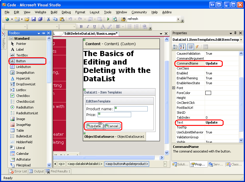 EditItemTemplate中。 若要包括删除支持,还需要在ItemTemplate/> 中添加另一个 ObjectDataSource。 使用此方法,这些嵌入的 ObjectDataSource 用于 ControlParameters以声明方式将 ObjectDataSource 参数绑定到用户输入控件(而不必在 DataList 事件处理程序UpdateCommand中以编程方式指定这些参数)。 此方法仍然需要一些代码,我们需要调用嵌入式 ObjectDataSource sUpdate()或Delete()命令,但需要远远低于其他三种方法。 此处的缺点是,多个 ObjectDataSources 在页面上杂乱无章,从整体可读性中减去。