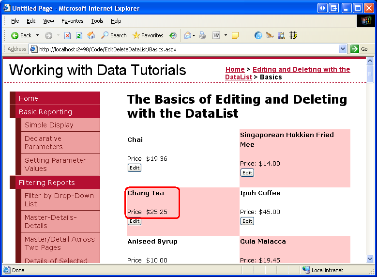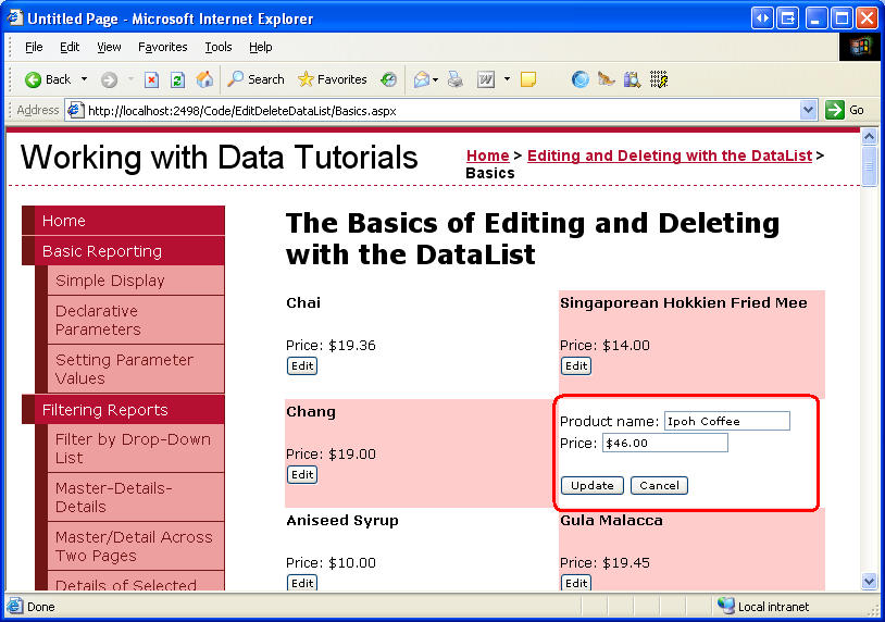 虽然 DataList 缺少该点并单击 GridView 喜欢的编辑和删除支持,但可以增强它以包含这些功能的简短代码。 在本教程中,我们了解了如何创建可删除的产品的两列列表,以及可编辑其名称和价格。 添加编辑和删除支持是包括相应 Web 控件ItemTemplateEditItemTemplate以及创建相应的事件处理程序、读取用户输入值和主键值以及与业务逻辑层交互的问题。