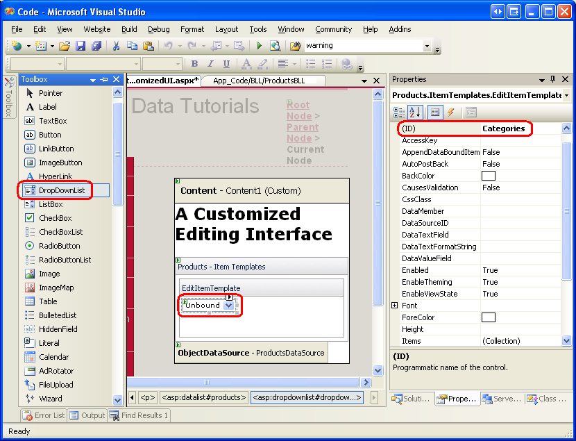 若要自定义编辑界面,请单击 DataList 智能标记中的“编辑模板”链接,然后从下拉列表中选择 EditItemTemplate 该选项。 将 DropDownList 添加到 EditItemTemplate 该列表并将其设置为 IDCategories.