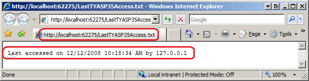 接下来,使用 ASP.NET ASP.NET 开发服务器访问开发环境中的 24 小时 3.5 自学 3.5 书籍复习页。 假设你使用具有在 Web 应用程序的根目录中创建和修改文本文件的足够权限的帐户登录到计算机,书籍评审看起来与以前相同,但每次访问页面时,日期和时间以及用户的 IP 地址都存储在 LastTYASP35Access.txt 文件中。 将浏览器指向此文件;应会看到类似于图 1 所示的消息。