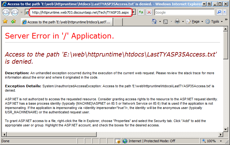 将 Web 应用程序部署到生产环境,然后访问托管的 “自学 ASP.NET 3.5 in 24 小时 ”书籍审阅页。 此时,应看到书评页面正常或错误消息,如图 2 所示。 某些 Web 主机提供程序向匿名 ASP.NET 计算机帐户授予写入权限,在这种情况下,页面将正常工作,而不会出错。 但是,如果 Web 主机提供程序禁止匿名帐户的写入访问,则UnauthorizedAccessException当页面尝试将当前日期和时间LastTYASP35Access.txt写入文件时,将引发TYASP35.aspx异常。