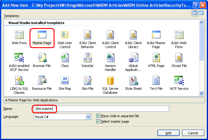 图 05:添加名为 Site.master 网站的母版页(单击可查看全尺寸图像)