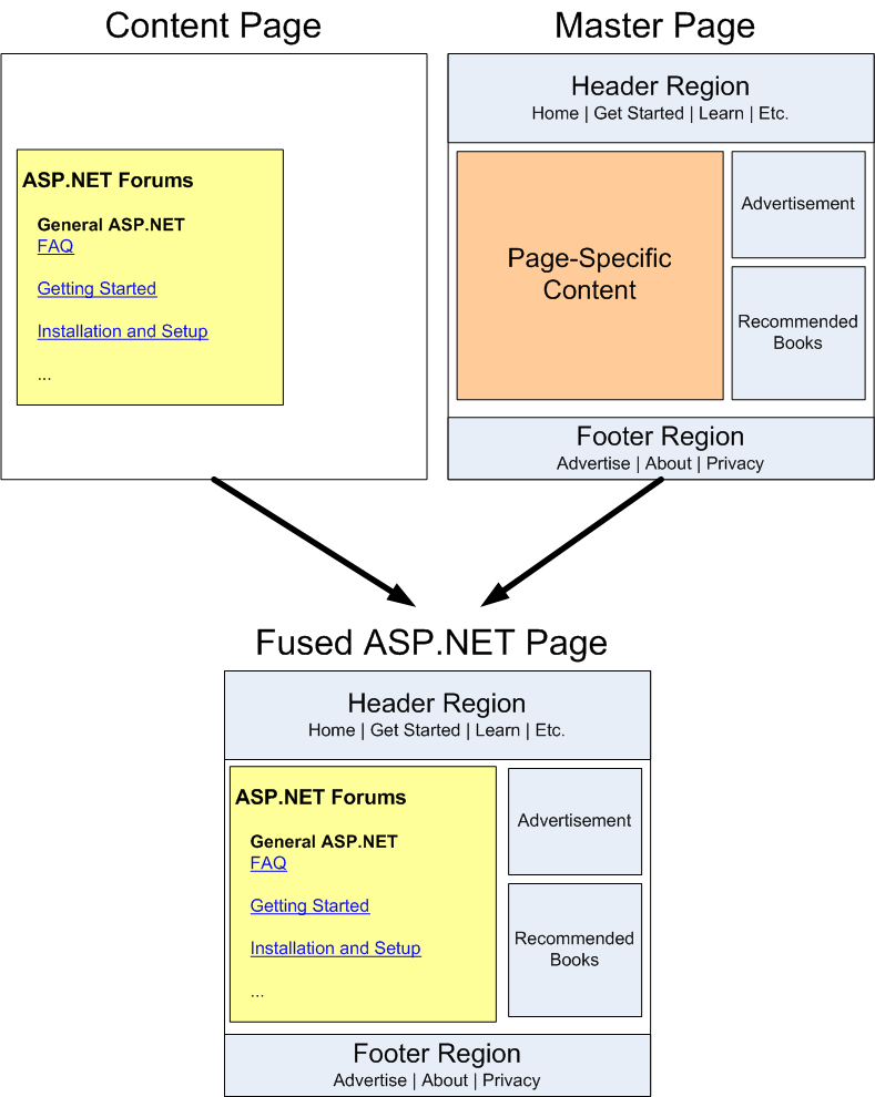 请务必了解,请求的内容页及其关联的母版页完全融合在 Web 服务器上并呈现为一个整体。 然后,最终用户的浏览器将发送生成的融合 HTML。 若要验证这一点,请通过转到“视图”菜单并选择“源”来查看浏览器收到的 HTML。 请注意,没有框架或任何其他专用技术用于在单个窗口中显示两个不同的网页。