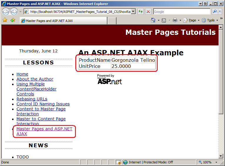 将 ScriptManager 控件添加到母版页后,现在可以向任何内容页添加 ASP.NET AJAX 框架功能。 让我们创建一个新的 ASP.NET 页,该页面显示 Northwind 数据库中随机选择的产品。 我们将使用 ASP.NET AJAX 框架的计时器控件每 15 秒更新一次此显示,显示新产品。