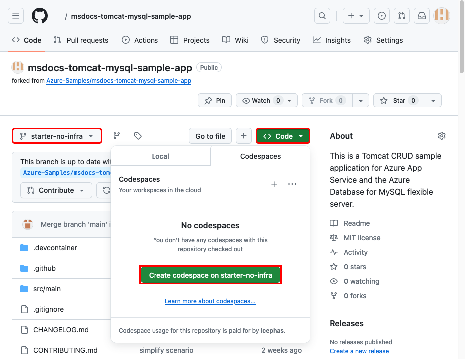 - 导航到 https://github.com/Azure-Samples/msdocs-tomcat-mysql-sample-app/fork。
