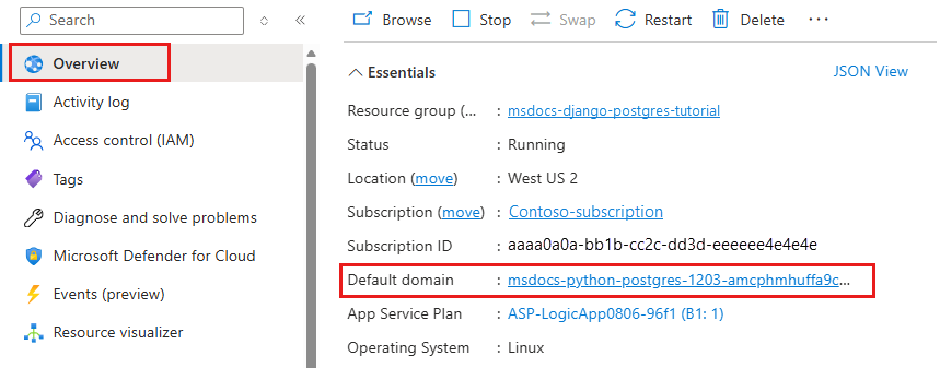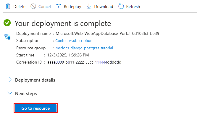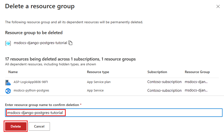 - 在“资源组”中,选择“msdocs-python-postgres-tutorial”。