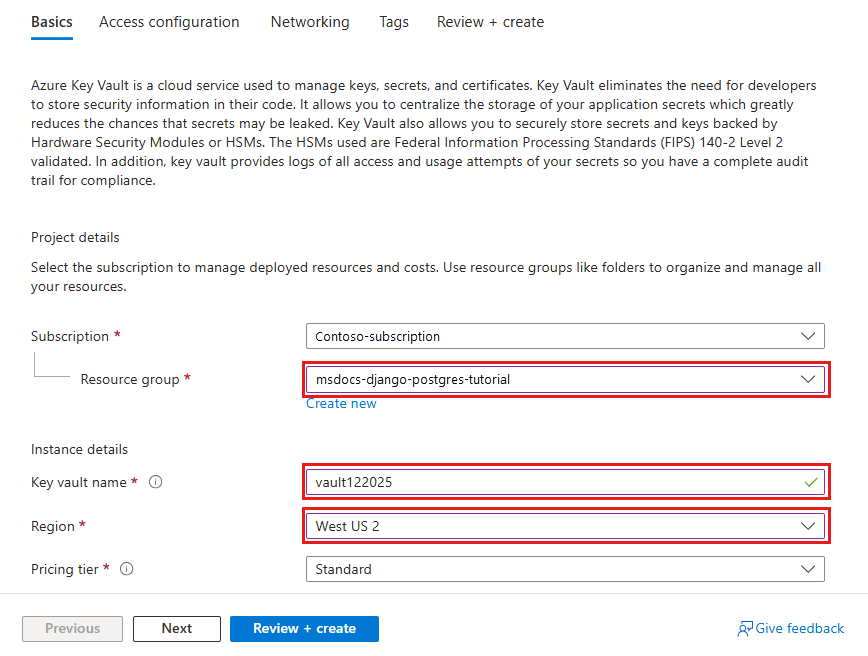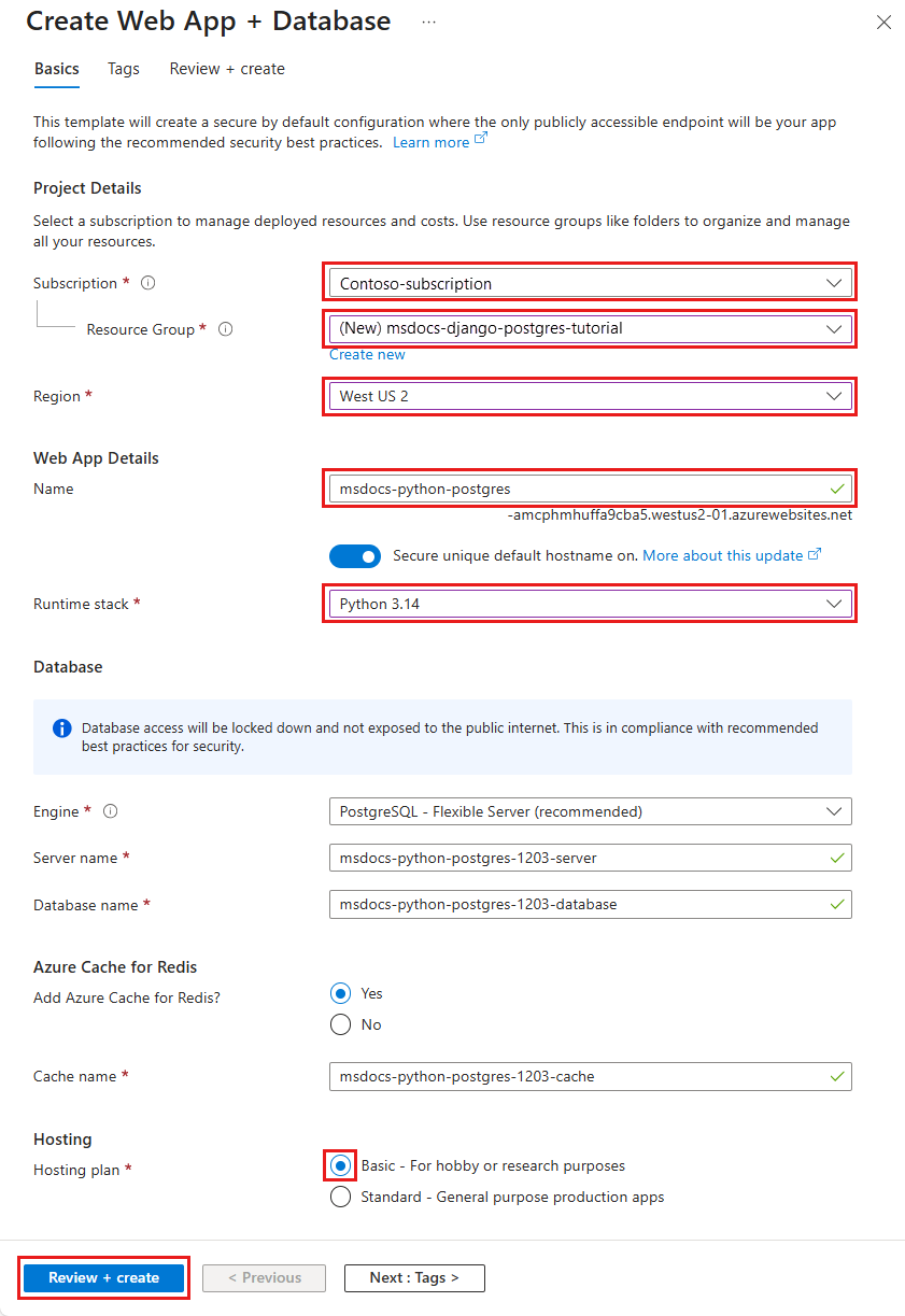 - 资源组:选择 “新建 ”并输入 msdocs-django-postgres-tutorial。