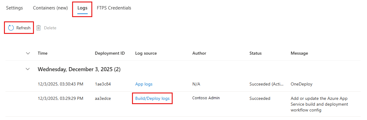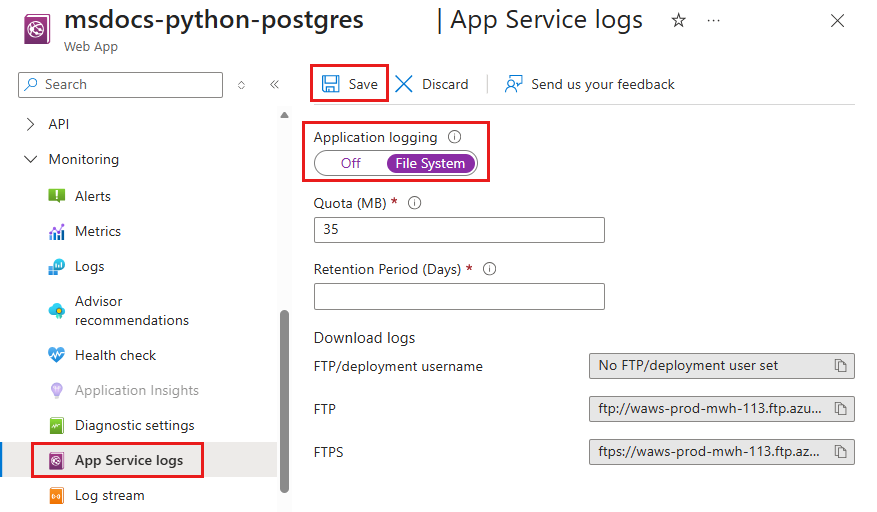 Azure 应用服务可以捕获控制台日志,以帮助你诊断应用程序的问题。 为方便起见,AZD 模板已 启用对本地文件系统的日志记录 ,并将 日志传送到 Log Analytics 工作区。
