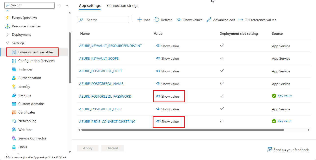 部署过程会为你生成 应用设置的连接变量。 安全最佳做法是完全将机密从应用服务中保留出来。 将机密移动到密钥保管库,并在服务连接器的帮助下将应用设置更改为 Key Vault 引用 。