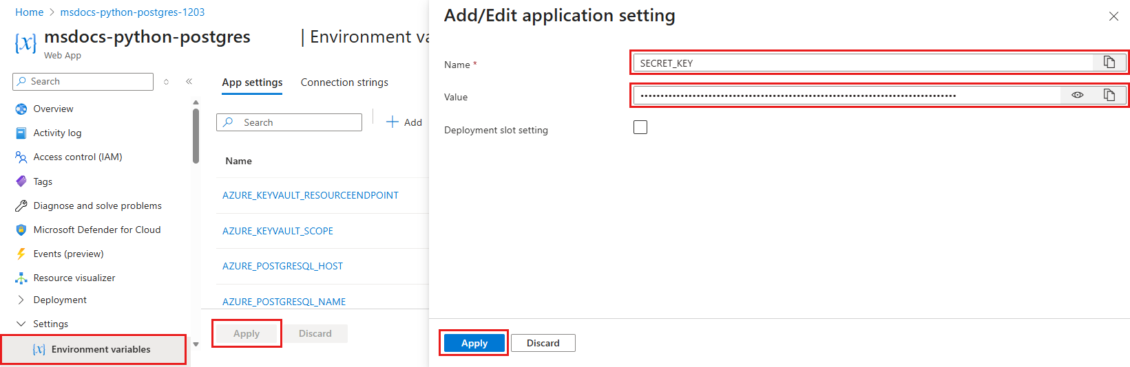 --settings "SECRET_KEY=@Microsoft.KeyVault(SecretUri=https://$KEY_VAULT_NAME.vault.azure.net/secrets/$SECRET_NAME)"