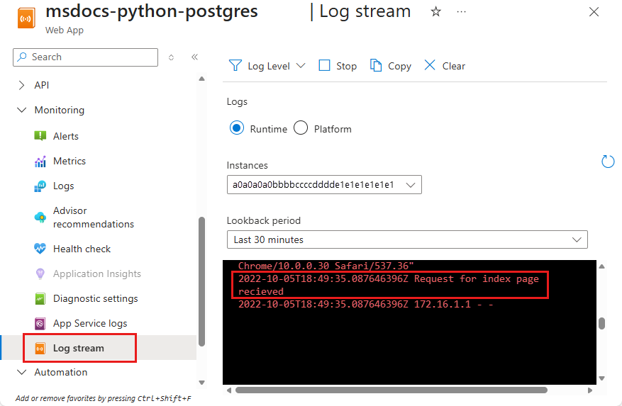 在 AZD 输出中,找到流式传输应用服务日志的链接,并在浏览器中导航到该链接。