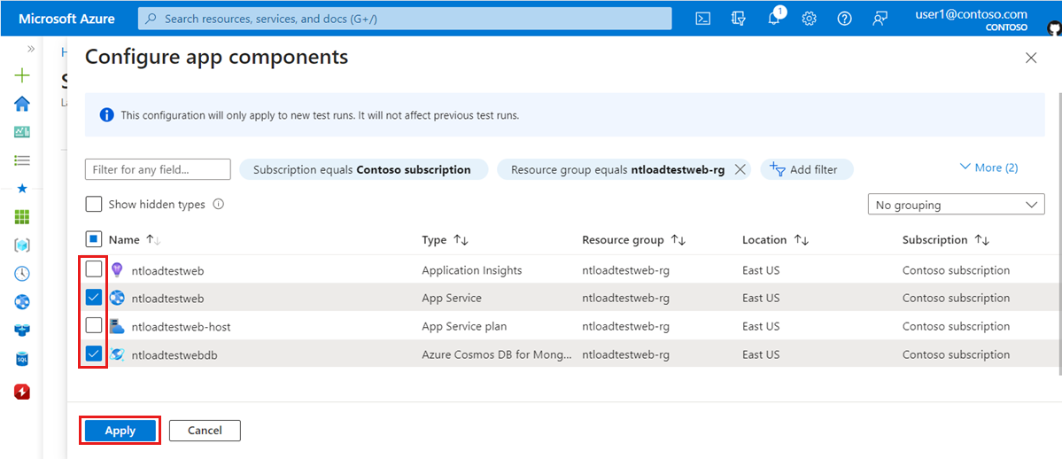 在“ 配置应用组件 ”页上,选中或清除要添加或删除的 Azure 资源的复选框,然后选择“ 应用”。