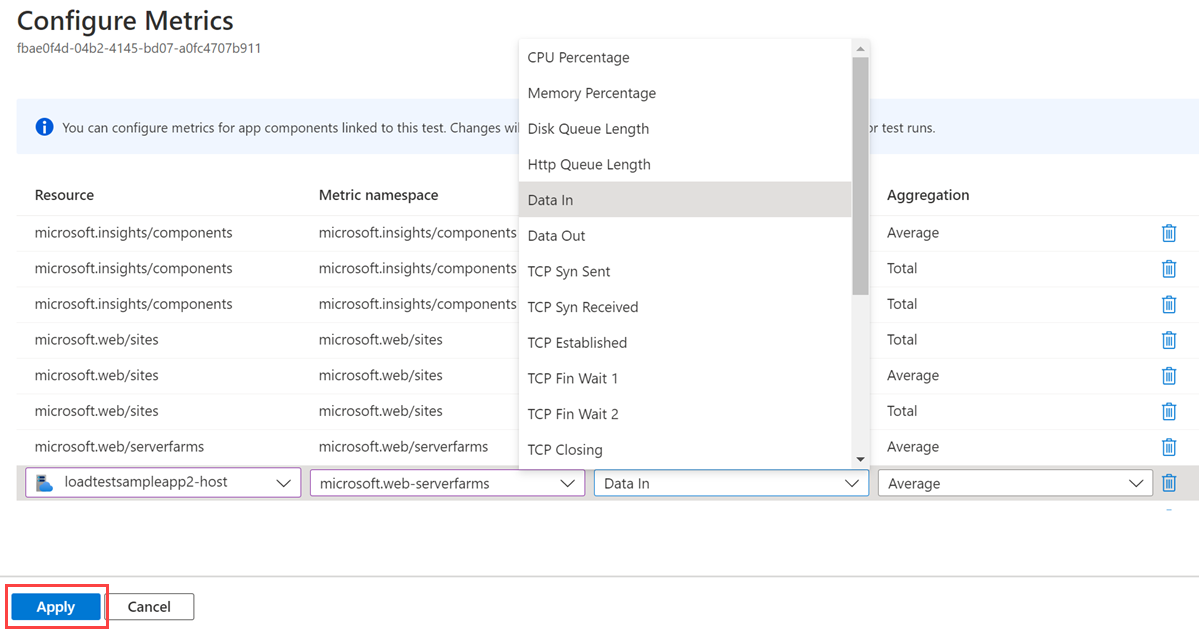 更新要捕获的指标列表,然后选择“ 应用”。
