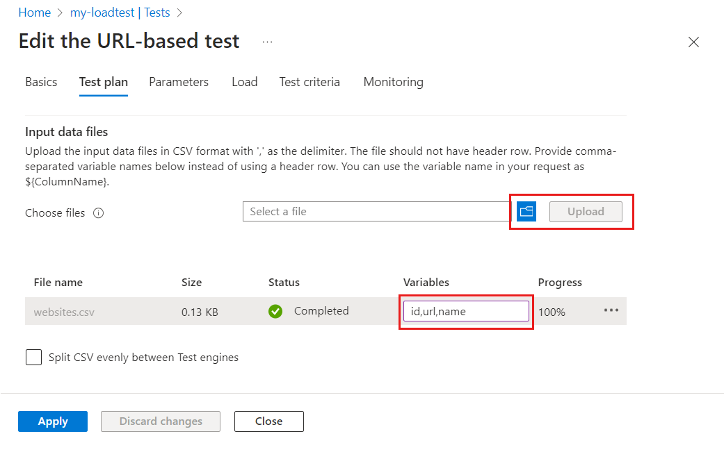 若要从 Azure 负载测试中的外部文件读取数据,必须在负载测试中将外部文件与测试脚本一起上传。 如果跨多个并行测试引擎实例横向扩展测试,可以选择跨这些实例均匀拆分输入数据。