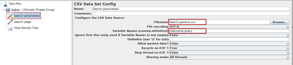 以下代码片段显示 JMeter 文件的提取,该文件使用 CSVDataSet 元素读取输入文件。 请注意, filename 该文件不包含文件路径。