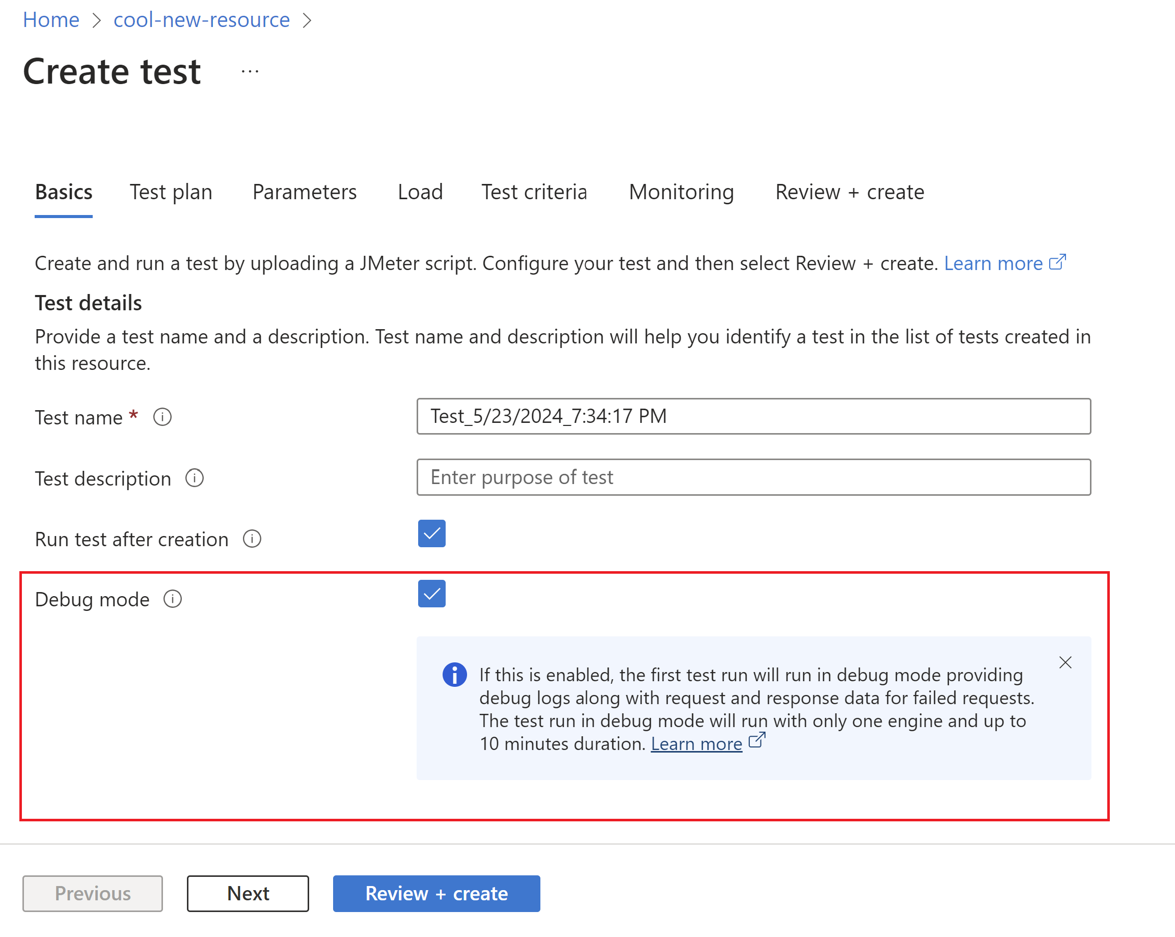 在“基本信息”选项卡中,选择“调试模式”。 请确保“创建后运行测试”处于选中状态。