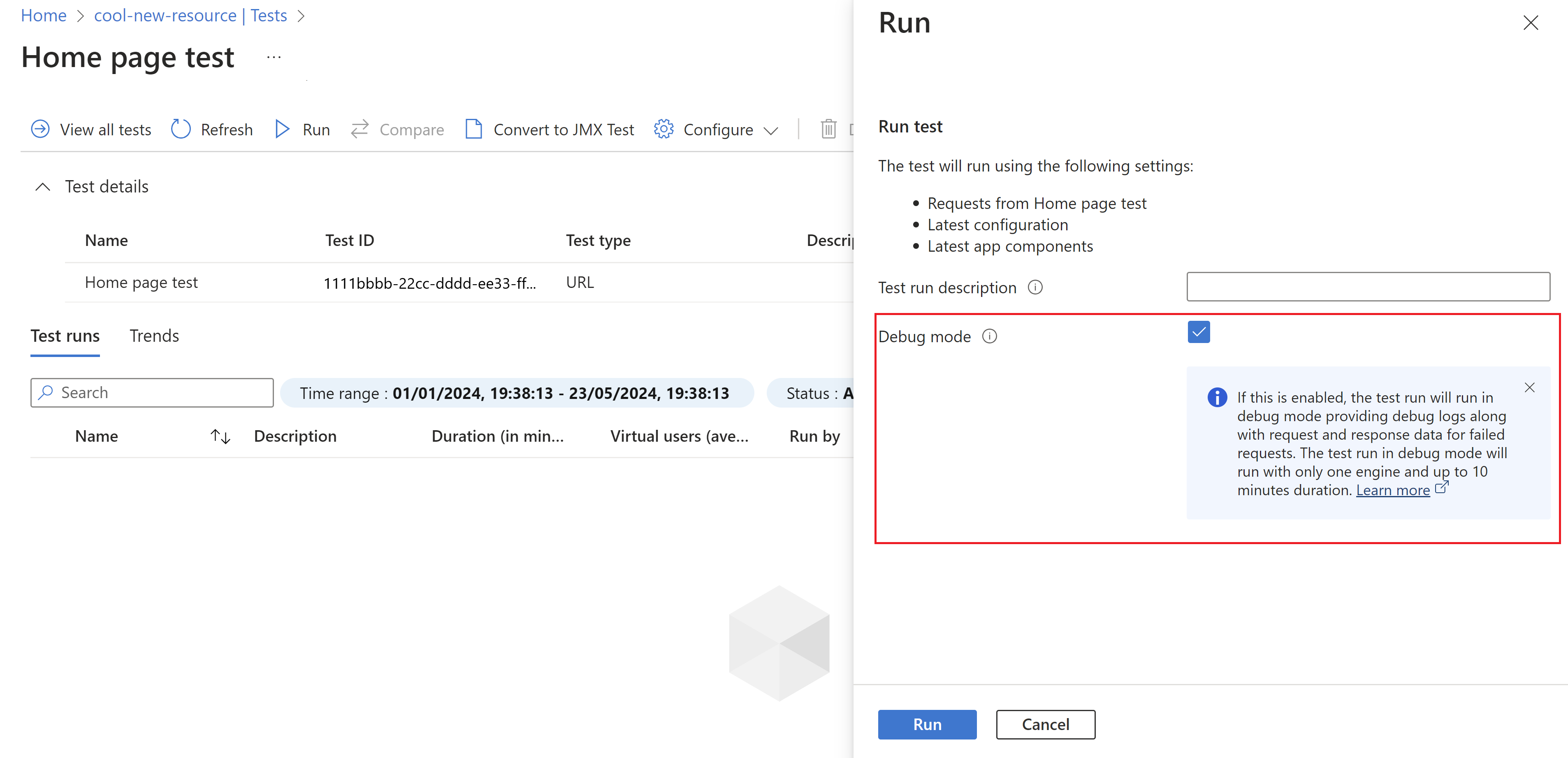 可以在创建新测试时为第一个测试运行启用调试模式。 还可以在运行测试或重新运行测试运行时启用调试模式。