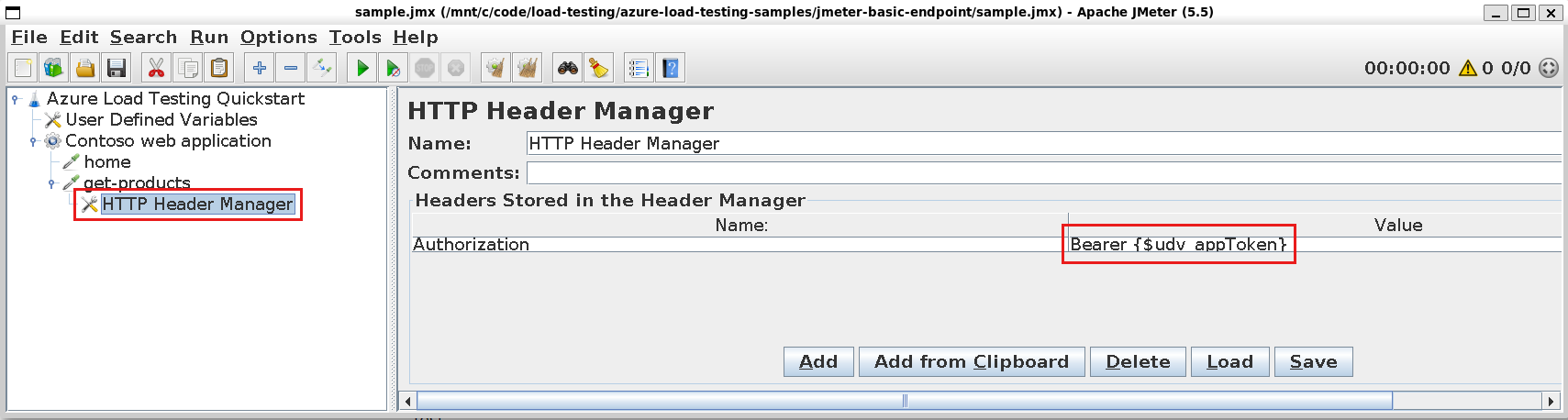 现在,可以使用 GetSecret 自定义函数检索 JMeter 脚本中的机密值,并将其传递给应用程序请求。 例如,使用 Authorization HTTP 标头将 OAuth 令牌传递给请求。
