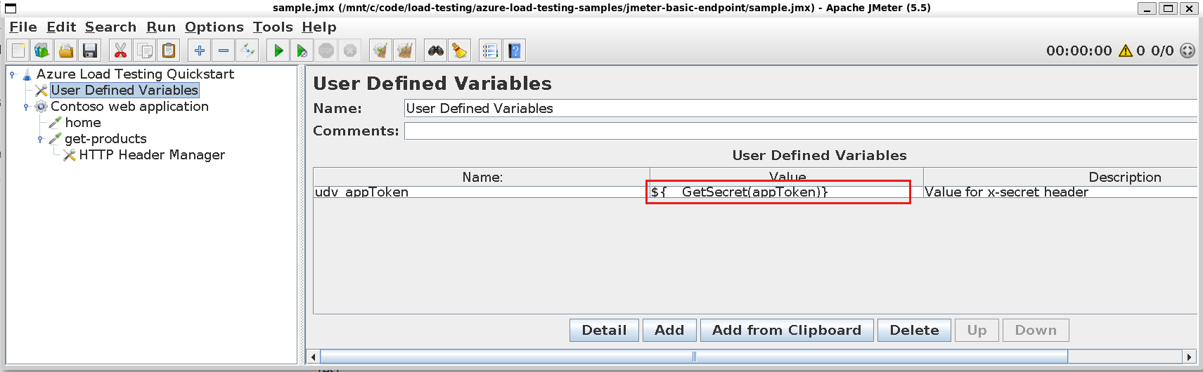 GetSecret来检索机密值:GetSecret函数会将从 Azure 密钥保管库或 CI/CD 机密存储区中检索值的过程抽象化。更新 JMeter 采样器组件以在请求中传递机密。