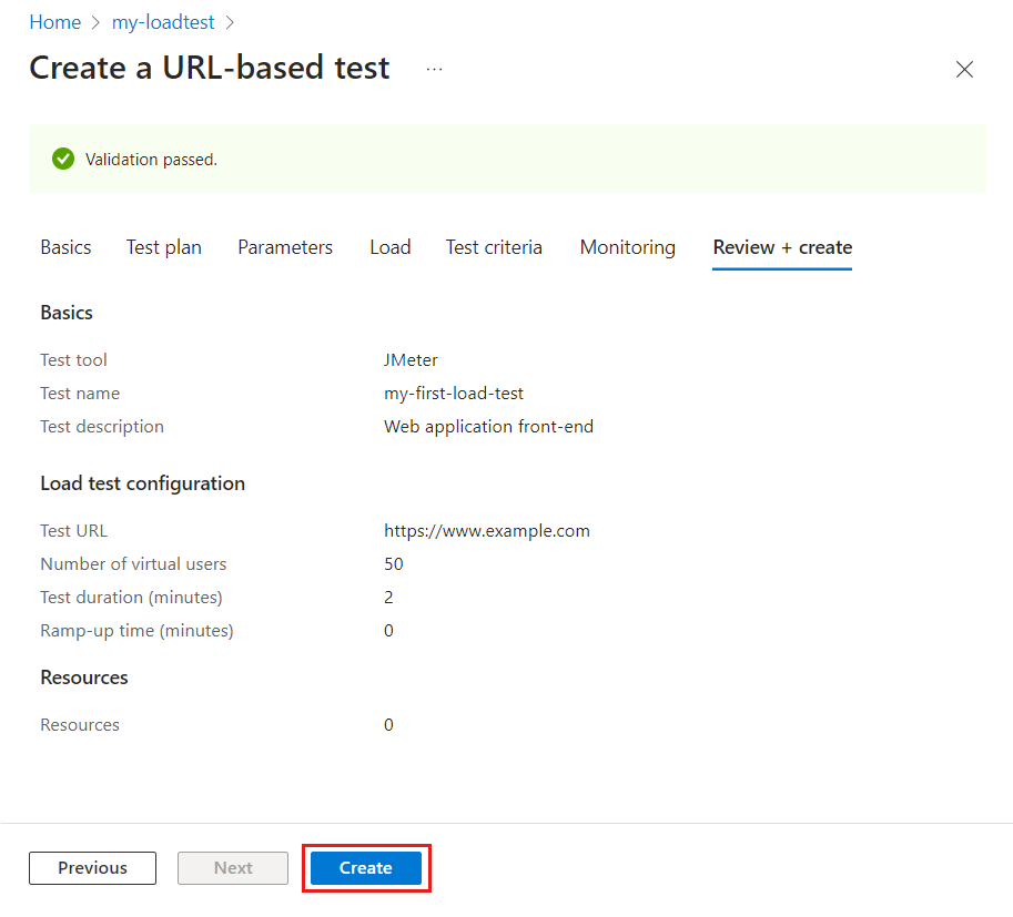 选择“查看 + 创建”以查看负载测试配置,然后选择“创建”以启动负载测试。