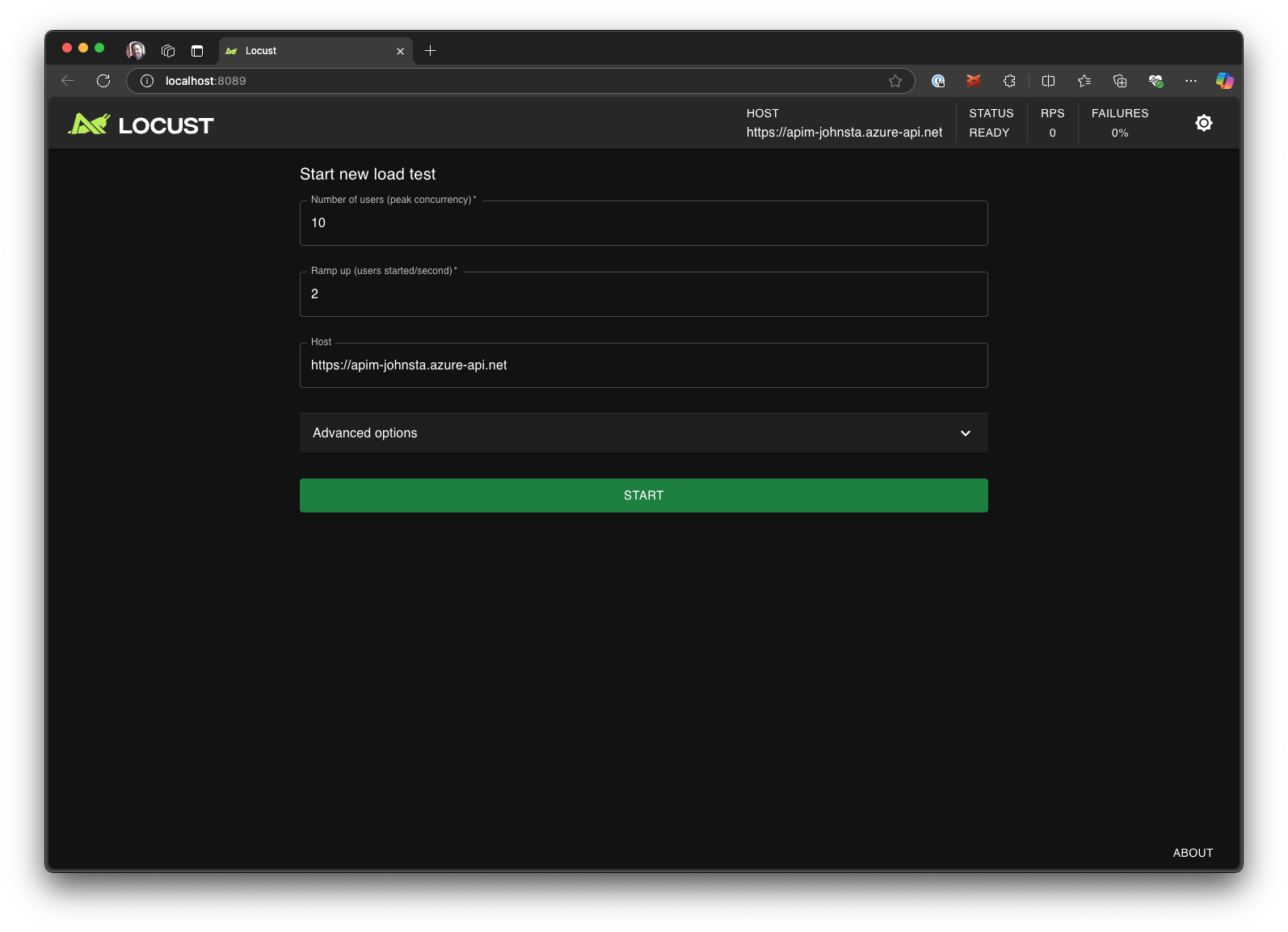 Locust Web UI 在浏览器中自动启动。 Locust 服务器准备好并打开浏览器可能需要几秒钟时间。