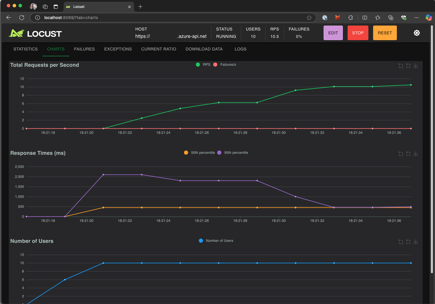 浏览 Locust UI 以分析响应时间、错误率和请求吞吐量。
