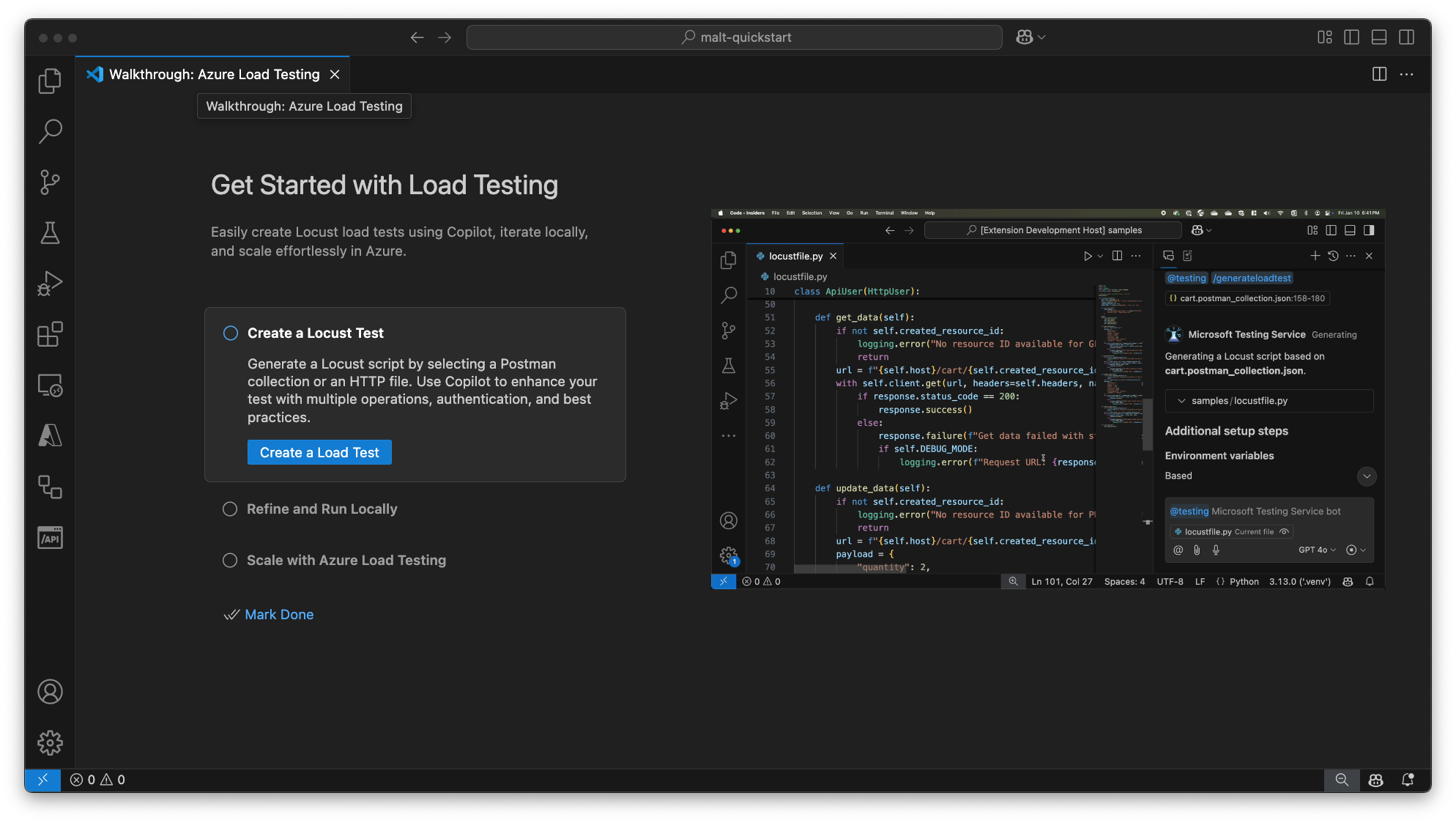 单击演练中的“ 创建负载测试 ”按钮,或运行 负载测试:从命令面板创建 Locust 测试 。