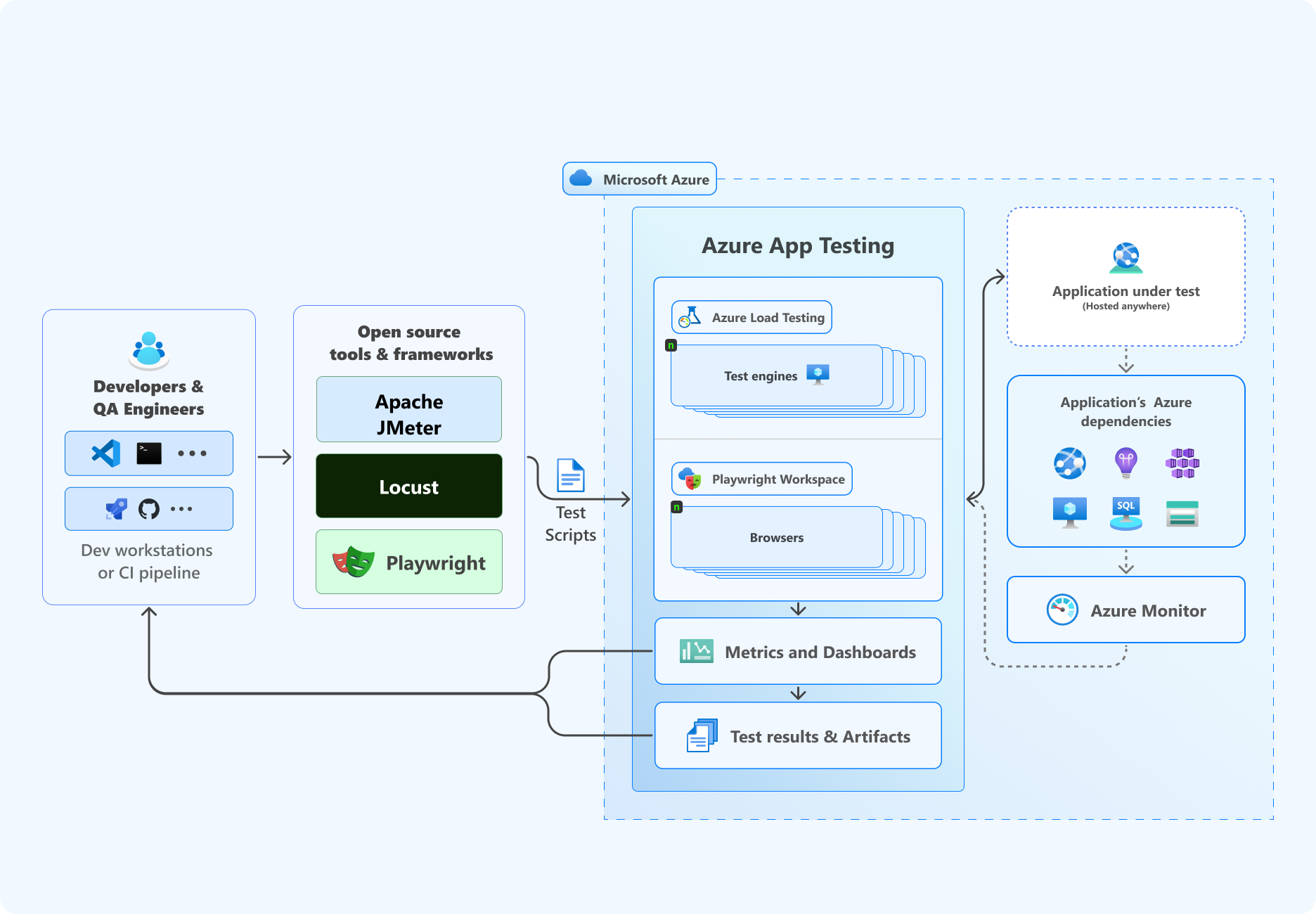 通过 Azure 负载测试,你可以为应用程序生成大规模负载并模拟流量,无论这些应用程序托管在何处。 它支持运行基于 Apache JMeter 的测试或基于 Locust 的测试。 它还支持从多个区域生成负载,并使你能够测试专用应用程序终结点。 它提供有关负载情况下应用程序性能的详细指标和见解,有助于识别瓶颈并优化性能。