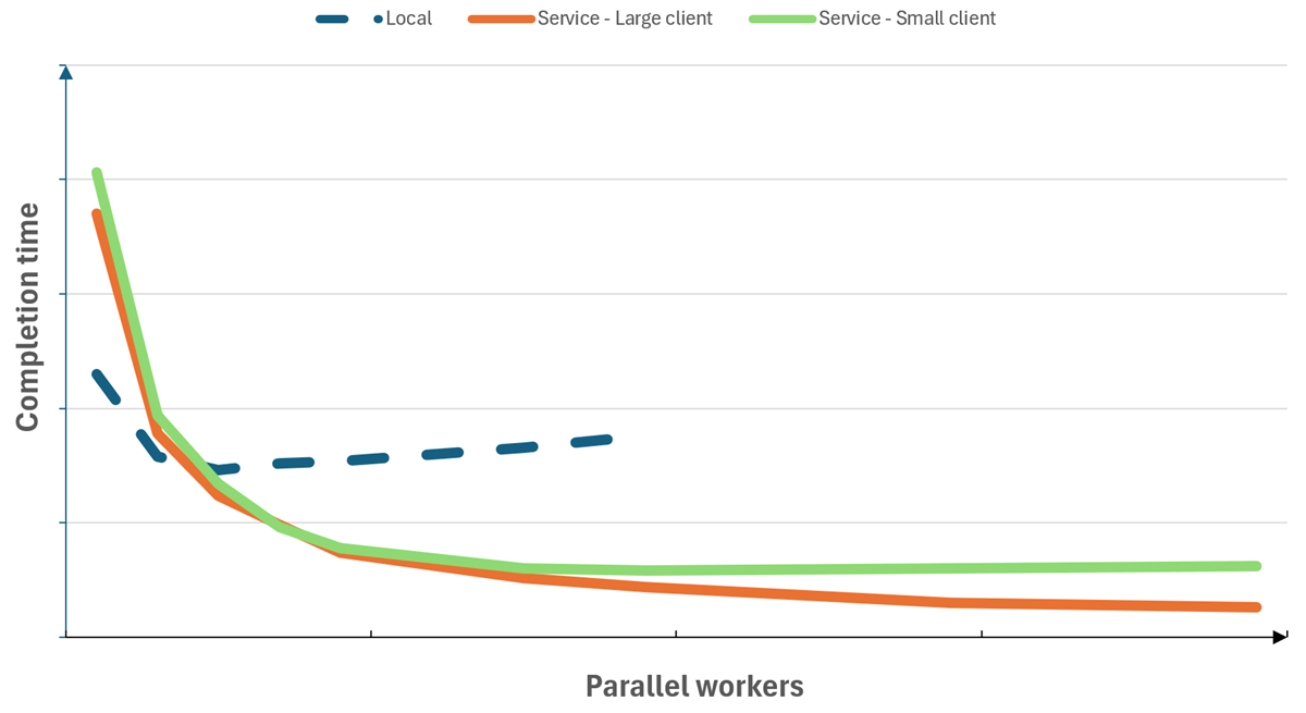 下图提供了运行测试套件的示例。 通过使用 Playwright Workspaces 而不是本地运行测试套件,可以显著增加并行度并减少测试完成时间。 请注意,在使用该服务时,完成时间会达到最小限制,此后添加更多工作进程只能发挥最低的效果。 该图表还显示了在客户端计算机上使用更多计算资源如何对使用该服务运行的测试的完成时间产生积极影响。