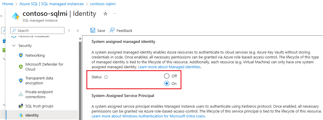 SMI 会在创建后自动分配给 Azure SQL 托管实例。 如果使用 Azure SQL 数据库进行 Microsoft Entra 身份验证,使用 Azure 服务主体在 SQL 数据库中创建 Microsoft Entra 用户时,必须分配 SMI。