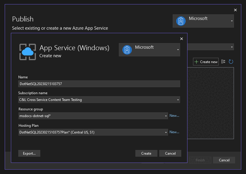 - 选择“创建”以关闭原始对话框。 Visual Studio 会在 Azure 中创建应用服务资源。