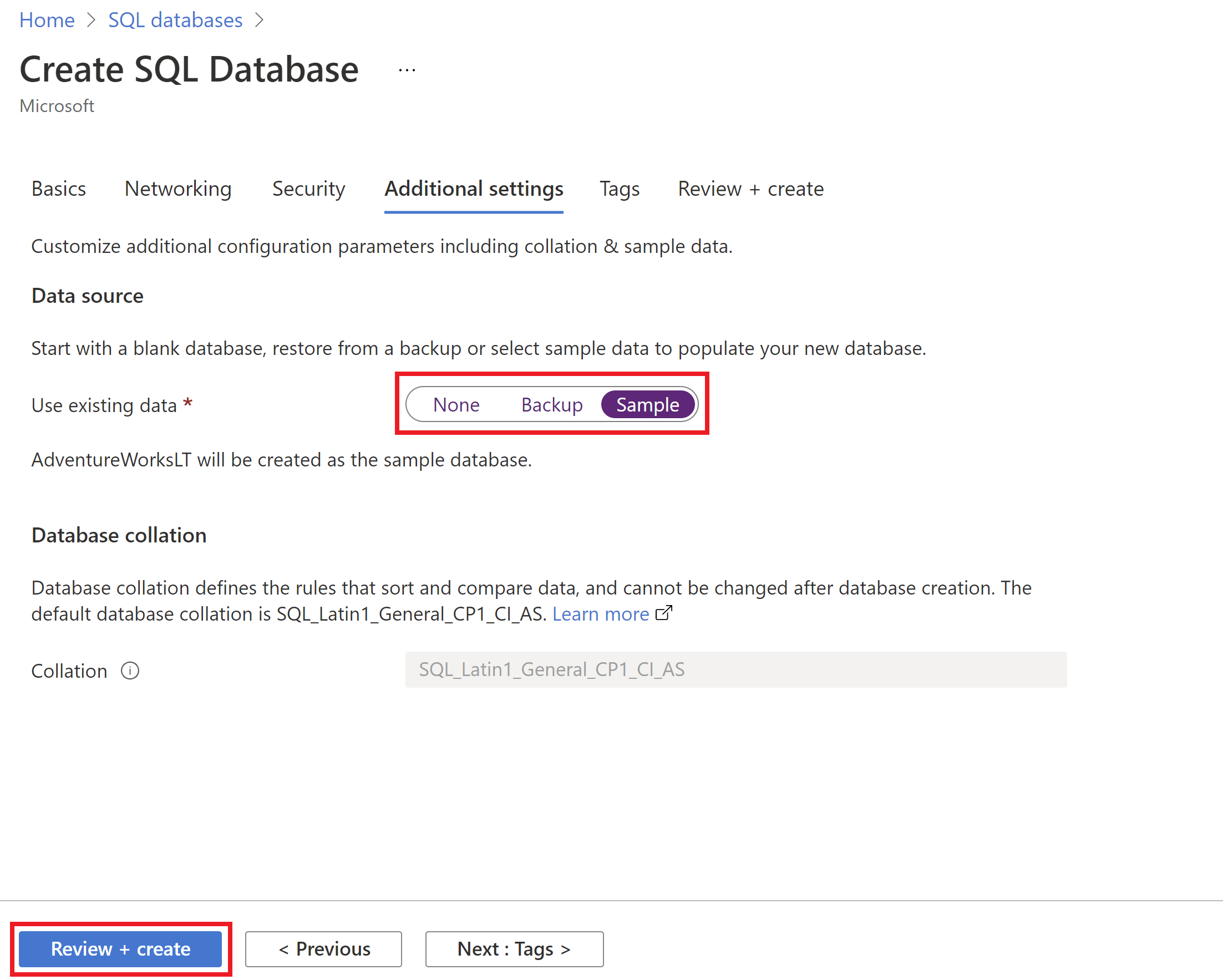 在“其他设置”选项卡上的“数据源”部分中,对于“使用现有数据”,请选择“示例”。 这将创建一个 AdventureWorksLT 示例数据库,此数据库包含可查询和试验的一些表和数据,而不是一个空数据库。 还可以配置数据库排序规则和维护时段。