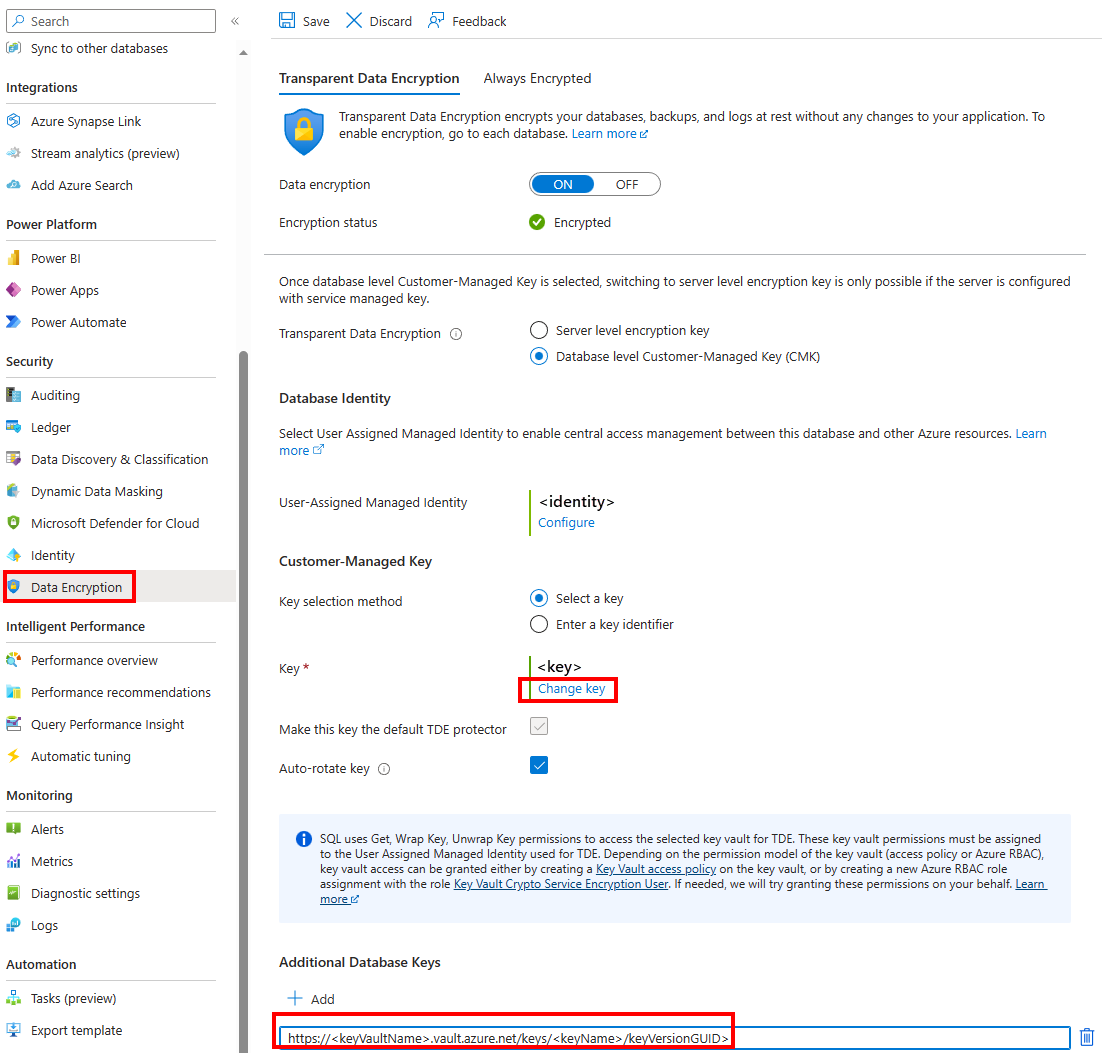 出现 “透明数据加密 ”菜单时,请为数据库配置 “用户分配的托管标识”、“ 客户管理的密钥”和 “其他数据库密钥 ”部分。