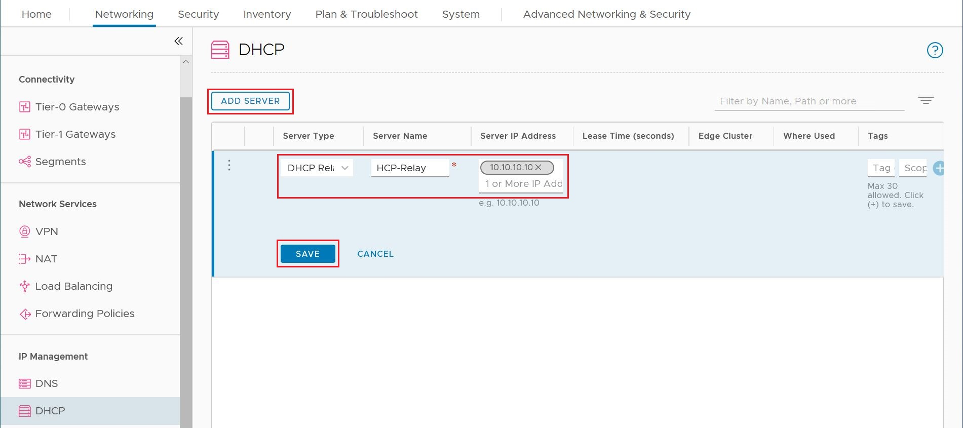 1. 在 NSX 管理器中,选择“网络”>“DHCP”,然后选择“添加服务器”