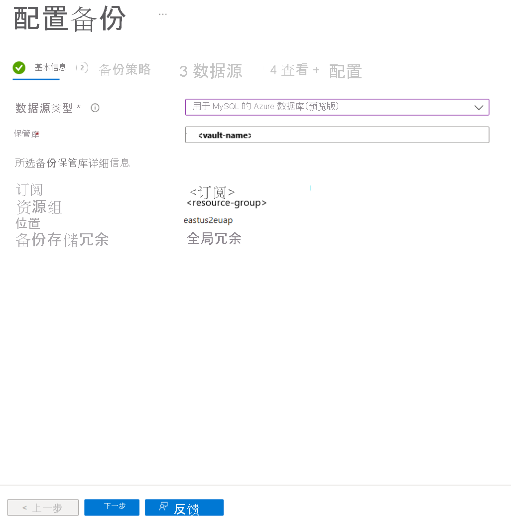 在“创建备份策略”窗格上,输入新策略的名称,然后选择“Azure Database for MySQL(预览版)”作为“数据源类型”。