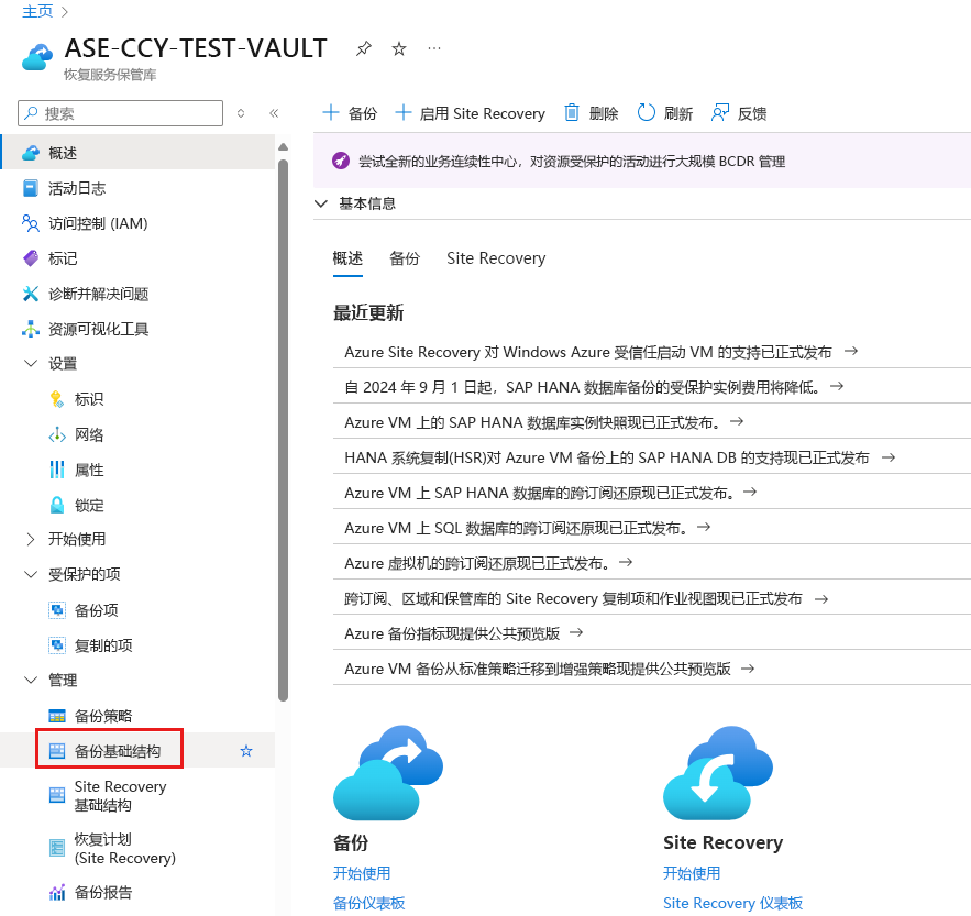 在“恢复服务”保管库中的“管理”下,选择“备份基础结构”。