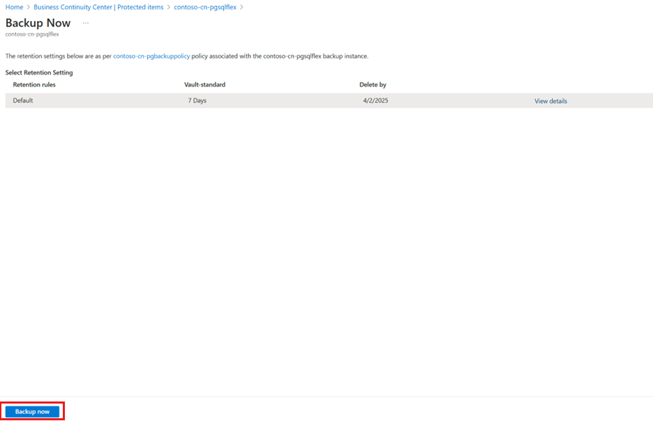 4. On the Backup Now pane, validate Retention rules as per the associated Backup policy, and then select Backup now.